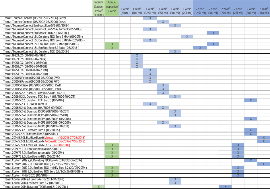 All passenger cars, Transit from model year 01/2006 and Rangers from model year 05/2011: every 24 months until the 6th year, thereafter every 12 months